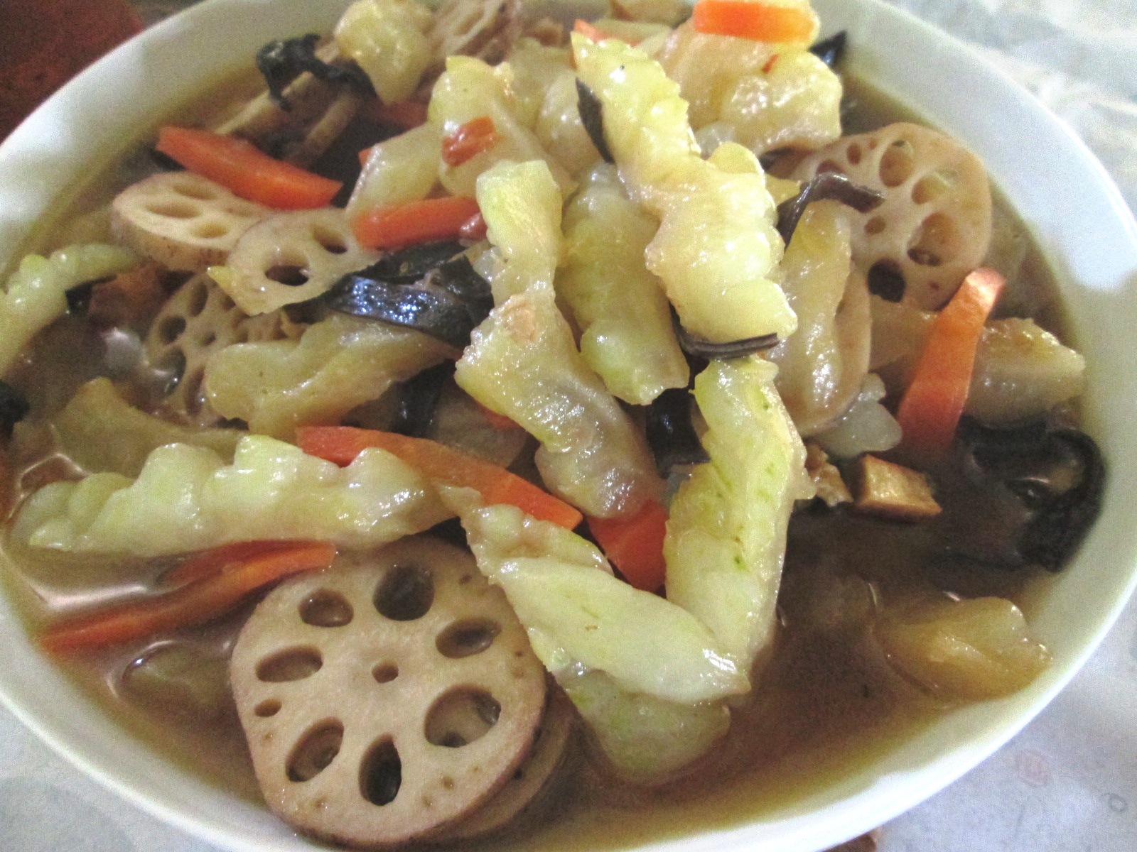 材料:蓮藕、苦瓜、紅蘿蔔、木耳、豆乾、水。